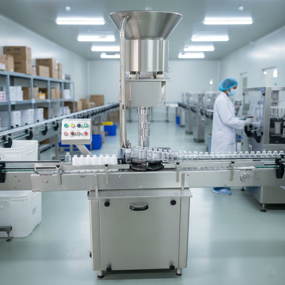The machine includes an Automatic Cap Elevator or Vibratory Bowl Feeder. This system automatically sorts the metal caps, ensures they are facing the correct direction, and feeds them into the capping chute. To prevent wastage, a "No Jar – No Cap" sensor ensures a cap is only released when a container is detected on the conveyor.