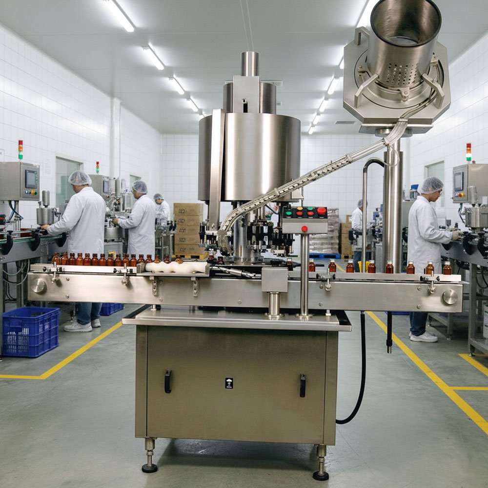 • Automatic Feeding: It includes an integrated Vibratory or Rotary Cap Elevator that automatically orients and feeds caps into the chute.