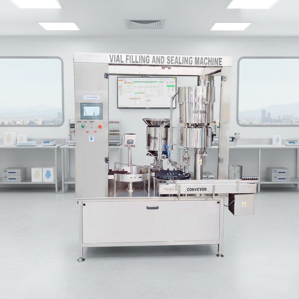 To meet strict pharmaceutical standards, the machine utilizes high-precision SS 316L volumetric syringes or optional peristaltic pumps. These systems provide a filling accuracy of ±1%. It also features a "No Vial – No Fill" sensor system, which ensures that the filling pump only activates when a vial is correctly positioned, preventing medicinal wastage and maintaining a clean conveyor environment.