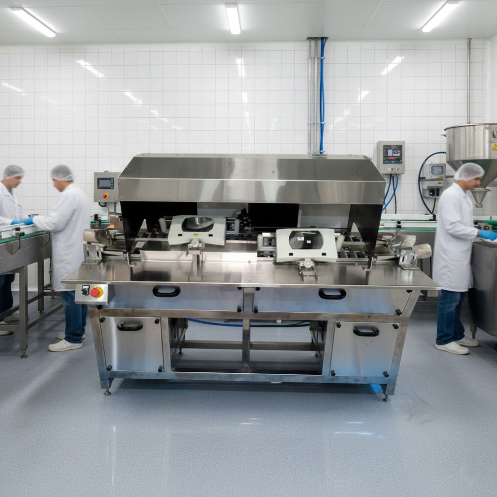 - Feeding & Bifurcation: Vials arrive from the capping machine via a central conveyor and are automatically split into two adjoining tracks.
