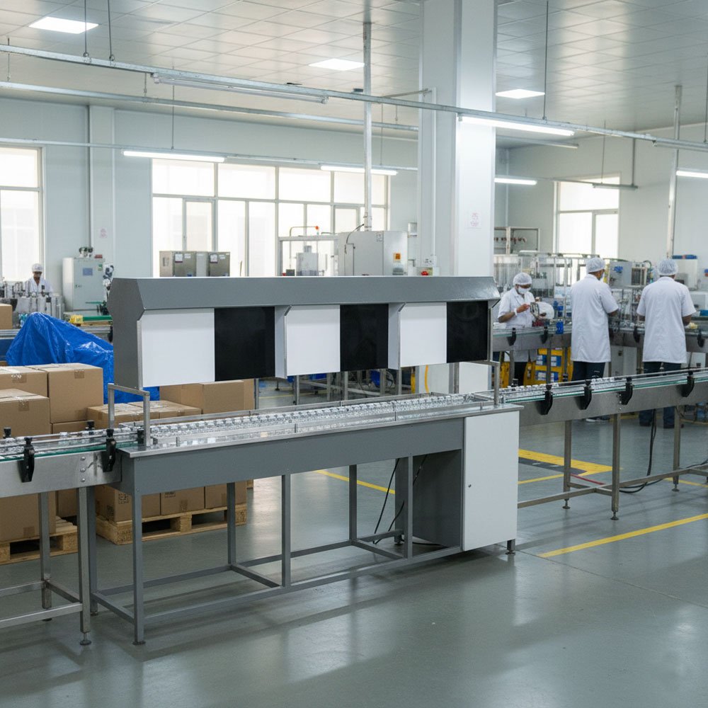 - Sorting: Defective units (containing particles or cracks) are set aside, while “Good” containers are placed back onto the central track.
